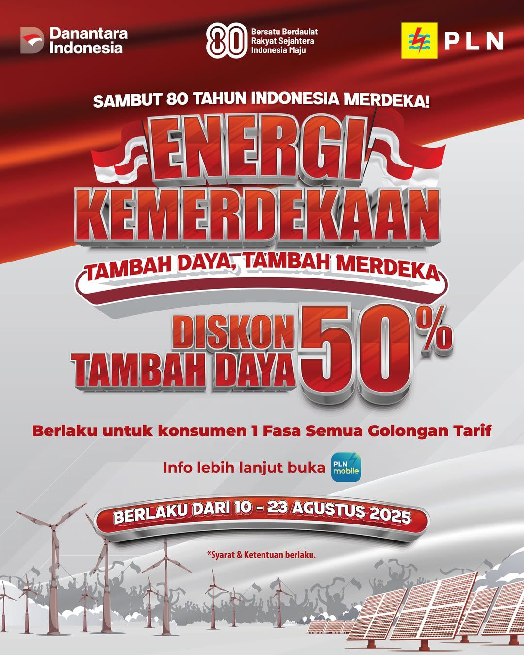 Bandungdaily.id – Dalam rangka memperingati Hari Ulang Tahun ke-80 Kemerdekaan Republik Indonesia, PT PLN (Persero) memberikan hadiah spesial untuk pelanggan setia melalui program bertajuk “Energi Kemerdekaan”. Program ini memberikan diskon hingga 50% untuk tambah daya listrik, dan berlaku selama periode 10 hingga 23 Agustus 2025.